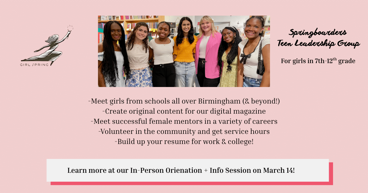 Girls ages 13-18, in 7th-12th grade for the 2026-2027 school year, are invited to join us for an interactive, get-to-know you session and learn more about what GirlSpring is all about! The Springboarders group works together to create content (articles, artwork, poetry) for our by girls for girls website, which is a safe, online platform for girls to share and learn from each other. Girls also help plan programs for their peers, like our annual STEM Fair, events with women leaders, and volunteer days throughout the year.