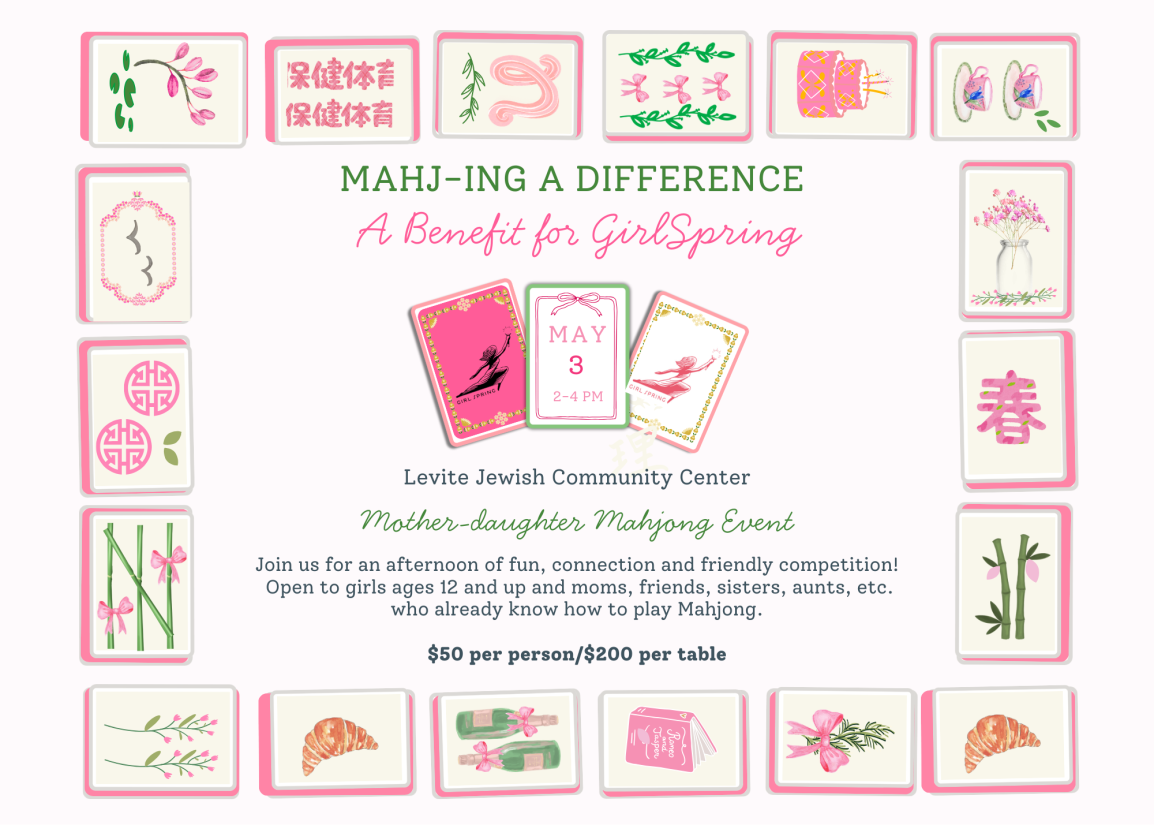 “Mah-jing” a Difference, a mother-daughter Mahjong event will be on May 3 from 2-4 PM CDT at the Levite Jewish Community Center. Join us for an afternoon of fun, connection, and friendly competition, benefitting GirlSpring! Open to girls ages 12 and up and moms, friends, sisters, aunts, etc. from beginners to seasoned pros.